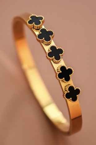 18K gold plated stainless steel hinged bangle bracelet. Inner oval diameter: 2.36" The bracelet is hypoallergenic, waterproof, fade-resistant, and tarnish-free, ensuring its beauty lasts for years. Perfect for everyday wear or special occasions. Clover Hinged Bangle