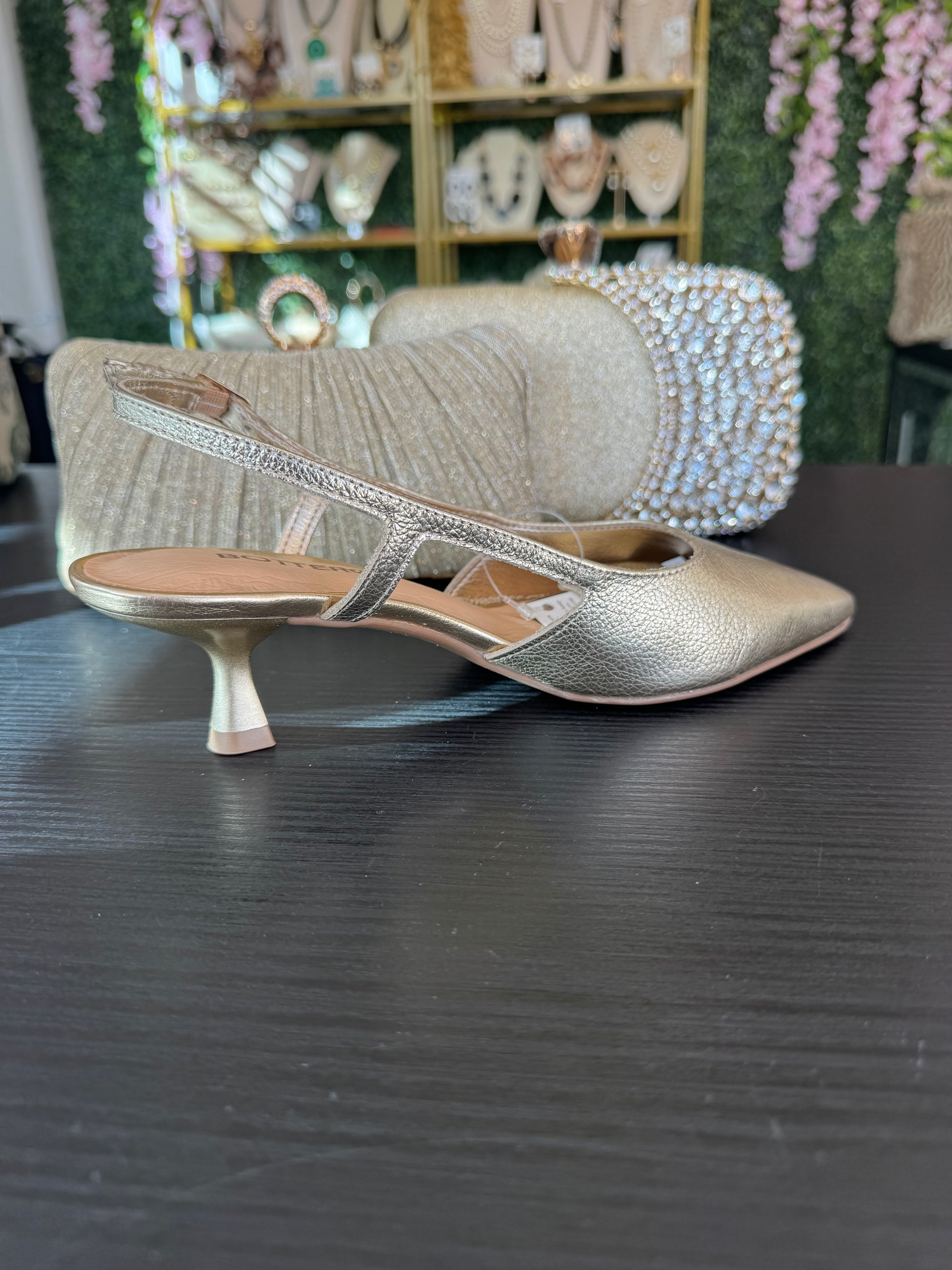 These Bottero Leather Gold Shoes are expertly crafted with a 1.5" heel. Made from high-quality leather, they provide both style and comfort, perfect for any occasion. The gold color adds a touch of sophistication to any outfit. The perfect choice for any fashion-forward individual.