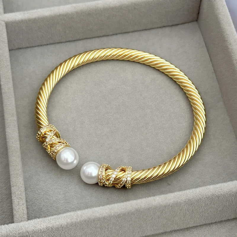 Pearl Geometric 316L Stainless Steel Copper Zircon 18K Gold Plated Plating Inlay Tube Bangle