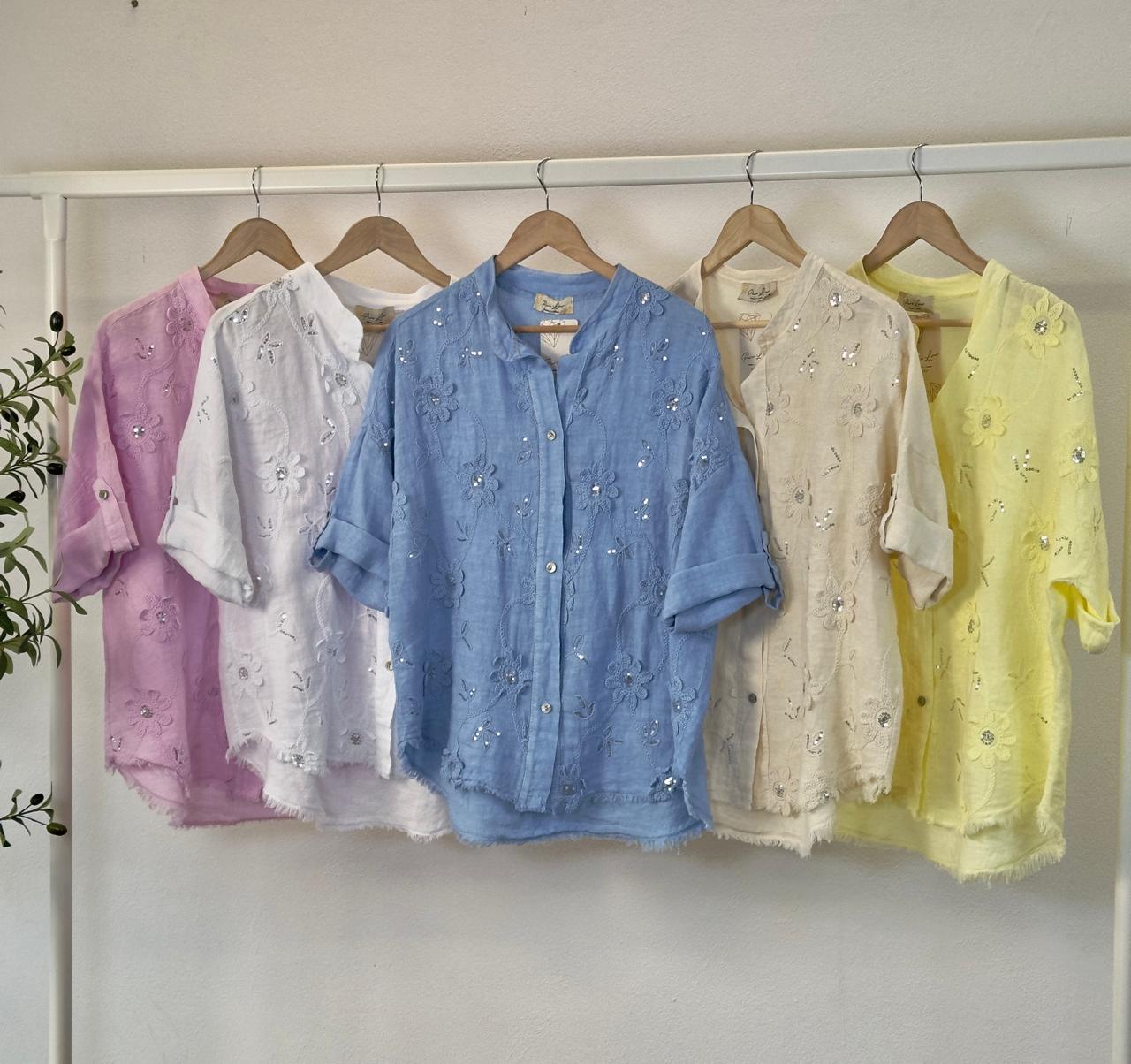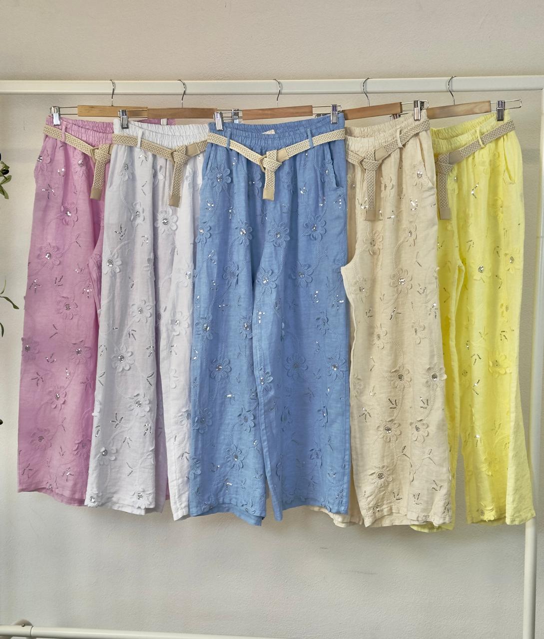The Italian Blue Floral Set includes an intricately embroidered shirt, coordinating belt, and palazzo pants, providing a cohesive and stylish ensemble. The palazzo pants offer comfort with a loose fit, while the embroidery enhances the garment's aesthetic appeal. This set combines elegance with ease, suitable for various occasions.