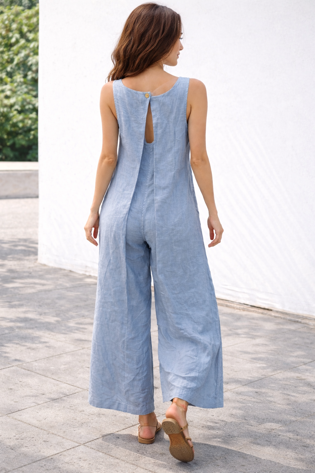 Italian Jumpsuit Blue Linen Wide-Leg with Keyhole Back Detail