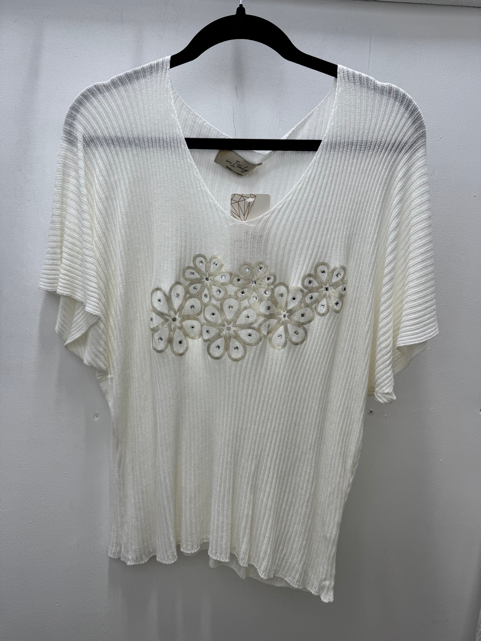 Italian White Ribbed Blouse with Floral Embroidery and Beaded Details