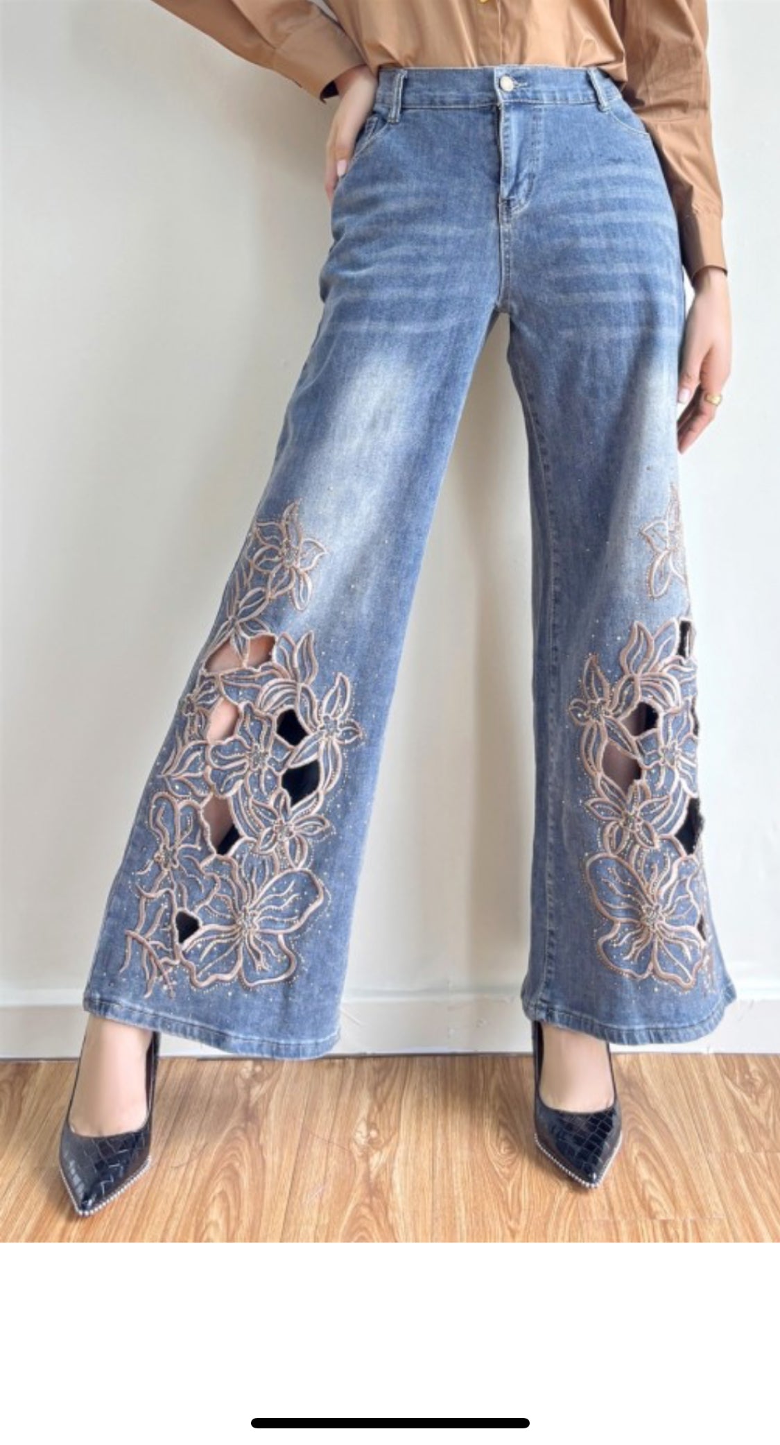 Wide Leg Jean With Floral Cutouts Embroidery